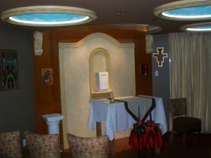 chapel faux-bois immitation d’acajou blond et faux ciel